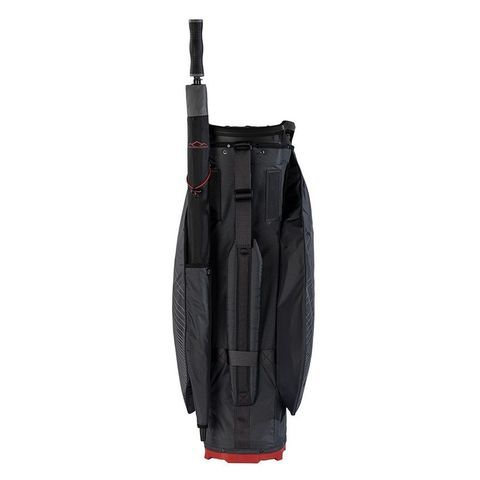 Vedenpitävä kärrybagi, jossa 20x25cm suuaukko ja pohjaan saakka ulottuvat jakajat 14 mailalle, sisältäen isomman lokeron putterille. Integroidut nostokahvat.